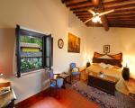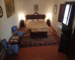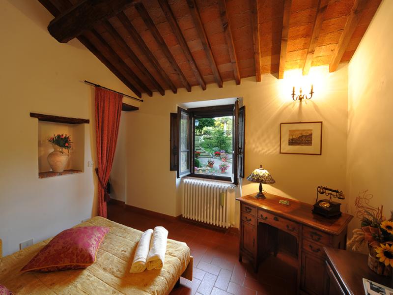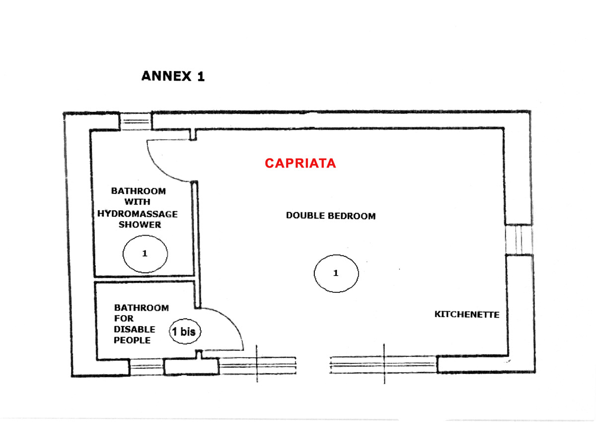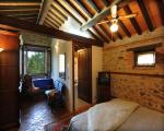 The name of this country cottage is Capriata and is about 30 m from the main house. This environment is arranged in a single plane, its name recalls the great wooden truss placed above the bed the Italian name is Capriata. The wooden beams, columns and tiles are exposed. The floor is partly wooden part was recovered the ancient terracotta that was found in the chapel next door. You log in through a French door that leads directly from the ground floor in the master bedroom and is equipped with two bathrooms, a disabled toilet and a bathroom with hydro-massage shower. The room has a classic wardrobe and one in which there is a small kitchen very popular with guests because equipped with everything needed for cooking. The room has its own garden with table and chairs, suitable for 2 or 3 people.