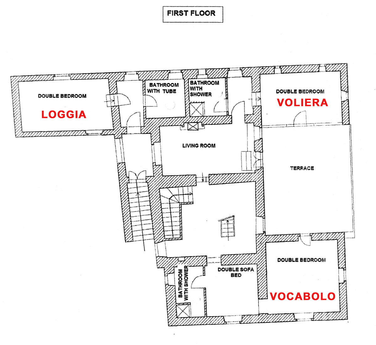 Suite VOCABOLO is a very big room (for 2/4 people) with direct access to the terrace through French windows and a sitting area separated by a curtain with a double sofa bed which can sleep two people, bathroom en suite.